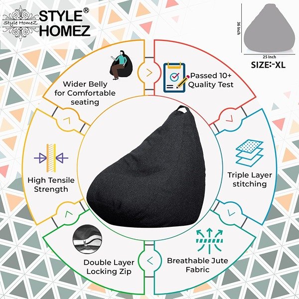 SIZE : Height : 36 Inch | Width : 25 Inch | Depth : 25 Inch | Circumfrence : 80 Inch | Weight : 500 gm | Size : XL | Cover Only | Bean Bag Refill Required : 1.2 KG’s