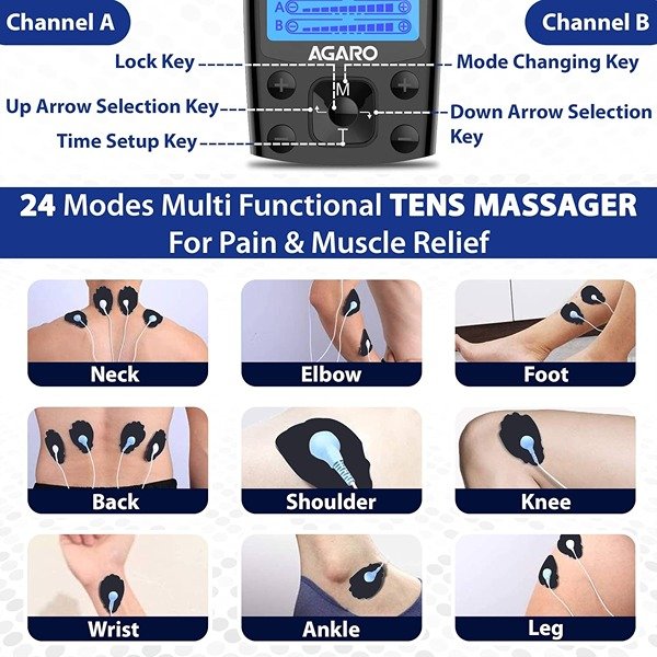 - Multifunctional tens massager : 24 preprogrammed massage modes for pain relief recommended for muscle spasms caused by various condition like arthritis, period pain, knee pain, neck pain, back pain, and multiple sports injuries