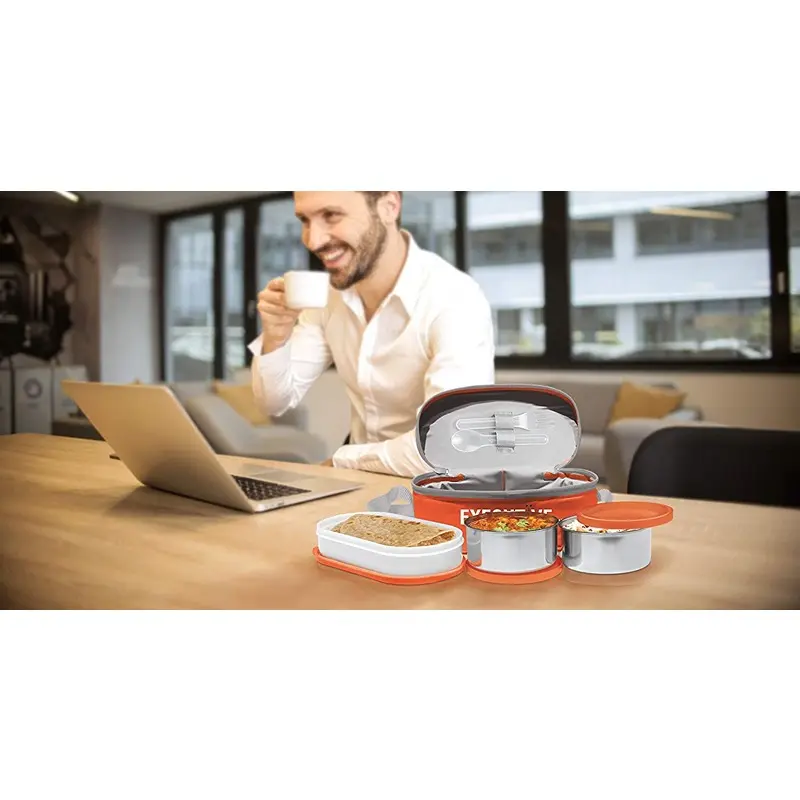 ? Materia type: Stainless Steel; No. of containers: 3; Capacity of containers: 2 Containers: 280ml Each+ 1 Container: 500ml; Contents include: 1 – Piece Exective Lunch Box (2 Round Container – 280 Ml Each and 1 Oval Container – 500 Ml); Colour: Orange