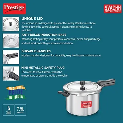 ? Package Contents: 1 x Prestige Svachh, 10727, 7.5 L, Svachh Aluminium Pressure Cooker, with deep lid for Spillage Control