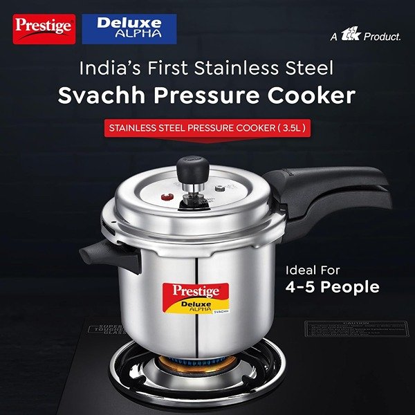 Prestige Svachh Deluxe Alpha Induction Base Outer Lid Stainless Steel Pressure Cooker | Deep Lid controls spillage | 3.5 Litres | Silver | Pressure Indicator | Straight Wall | Gasket-Release System
