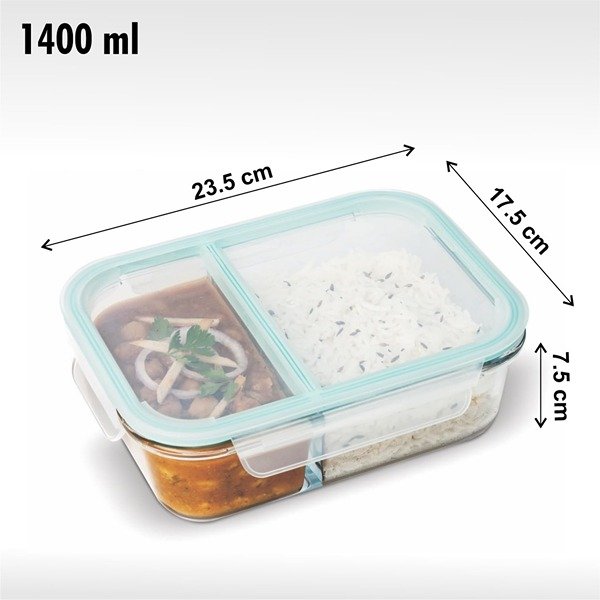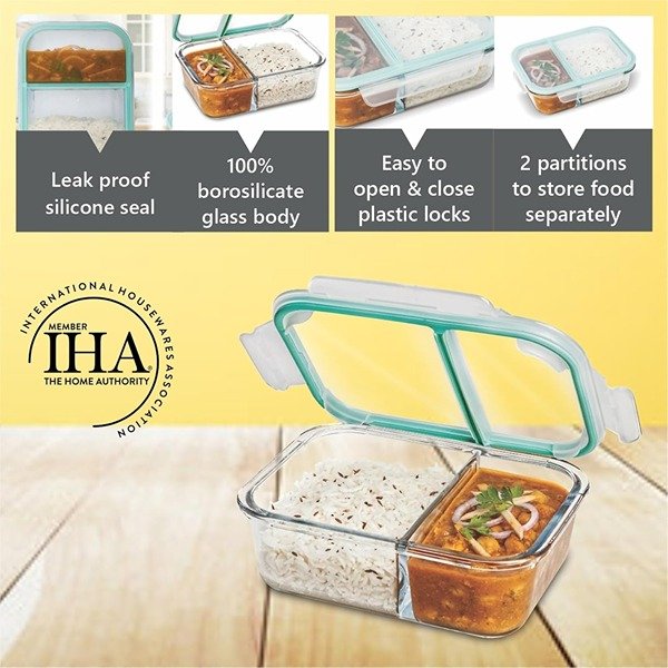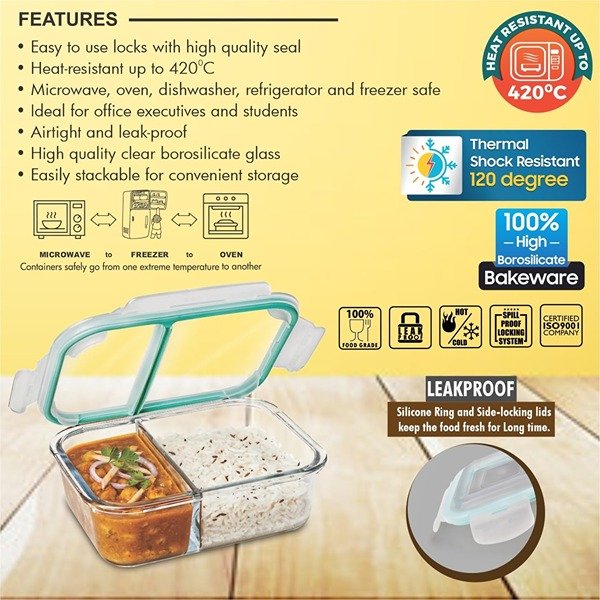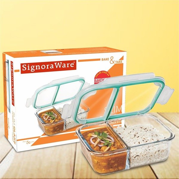 Features Detail: This Signoraware jumbo lunch box boasts a super secure, airtight lid, so say goodbye to messy leaks and spills in your bag! The two handy compartments let you keep different parts of your meal separate and organized. Plus, the clear glass design means you can easily see what culinary delights await you inside.