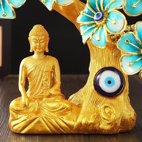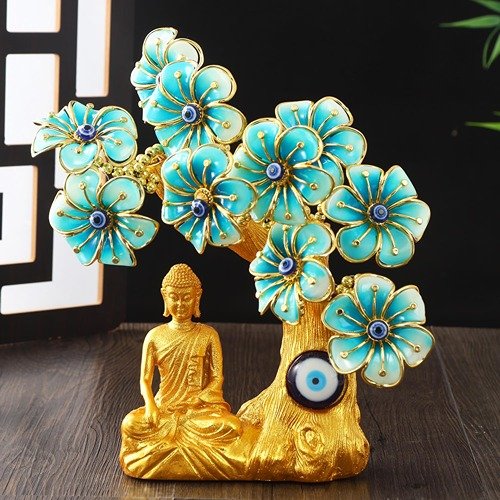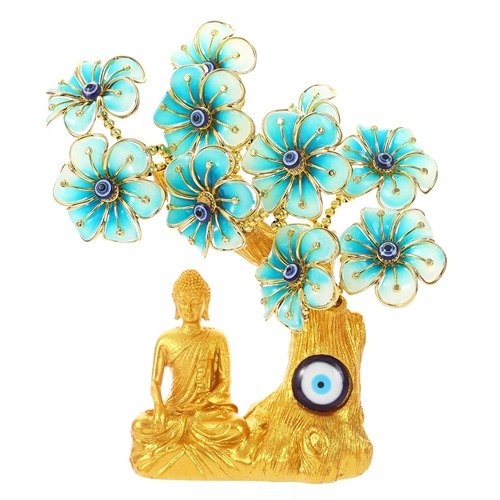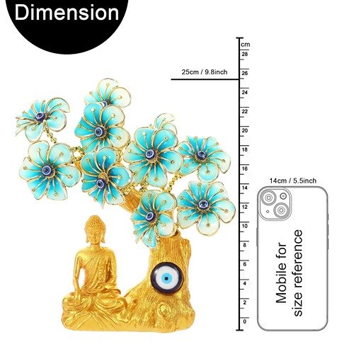 Tree of Life with Buddha Mint Flower – (Gold, 25Cm) Evil Eye Tree Feng Shui Items for Good Luck Positive Energy Vastu Shelf Living Room Home Decor House Warming Gifts and Decoration