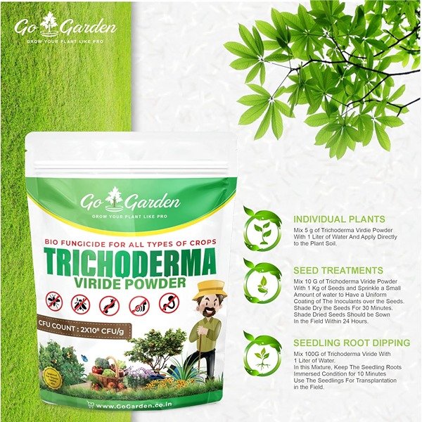 APPLICATION: INDIVIDUAL PLANTS – Mix 5g of Trichoderma viridi with 1 liter water and apply directly to plant soil. SEED TREATMENT – Mix 10 g of Trichoderma viride with 1 kg of seeds. ROOT DIPPING: Mix 100 g of Trichoderma viridi with 10 liters of water. POTTING SOIL: Mix 100 g of Trichoderma viride with 15-20 of potting soil